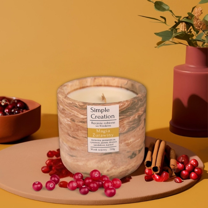 „Magia Żurawiny” to zapach, który łączy świeżość cytrusów i pomarańczy z soczystą żurawiną oraz aromatycznym cynamonem. W sercu kompozycji unosi się subtelna wanilia, białe piżmo i karmel, które dodają ciepła i zmysłowej głębi. Idealna świeca do stworzenia przytulnej, pełnej energii atmosfery w każdym wnętrzu.