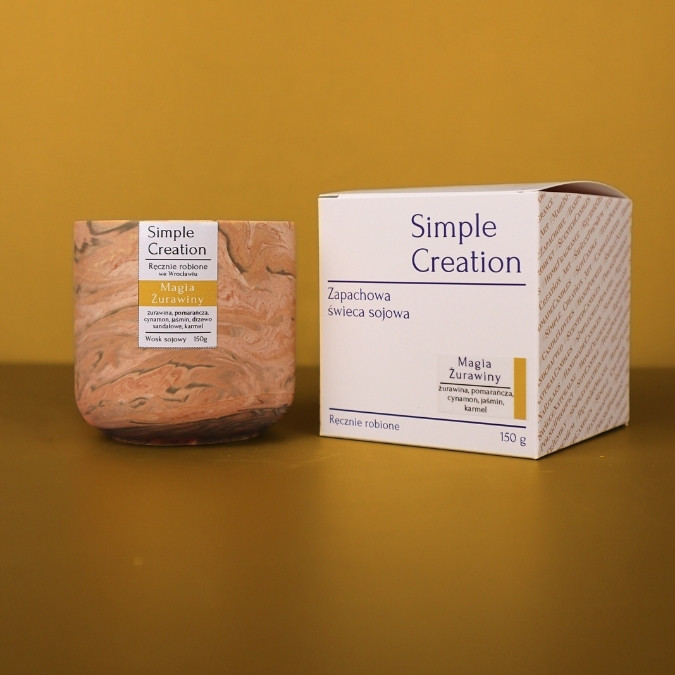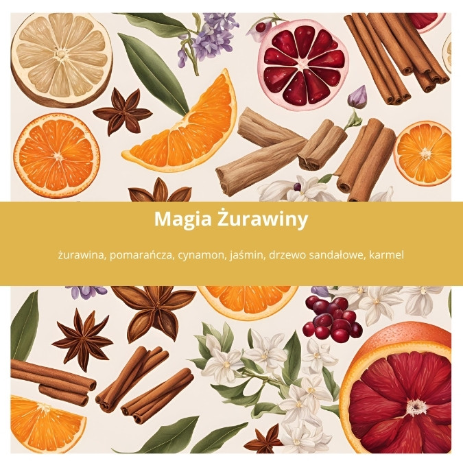„Magia Żurawiny” to zapach, który zabierze Cię w podróż przez intensywne, owocowe nuty i ciepłe przyprawy, tworząc niezapomnianą atmosferę. Kompozycja otwiera się orzeźwiającą mieszanką cytrusów, nut zielonych i pomarańczy, które od razu wypełniają przestrzeń świeżością i energią. Z czasem, zapach przechodzi w serce, gdzie soczysta żurawina łączy się z korzennym cynamonem, wprowadzając nuty słodko-pikantne, które budzą zmysły i dodają przytulnego ciepła. Baza świecy to delikatne akordy wanilii, białego piżma i karmelu, które tworzą zmysłowy, miękki finisz, pozostawiając w powietrzu subtelną, długotrwałą woń. „Magia Żurawiny” to zapach, który doskonale komponuje się z chłodniejszymi dniami, rozgrzewając wnętrze. To zapach, który wypełnia przestrzeń radością, ciepłem i odrobiną magii.